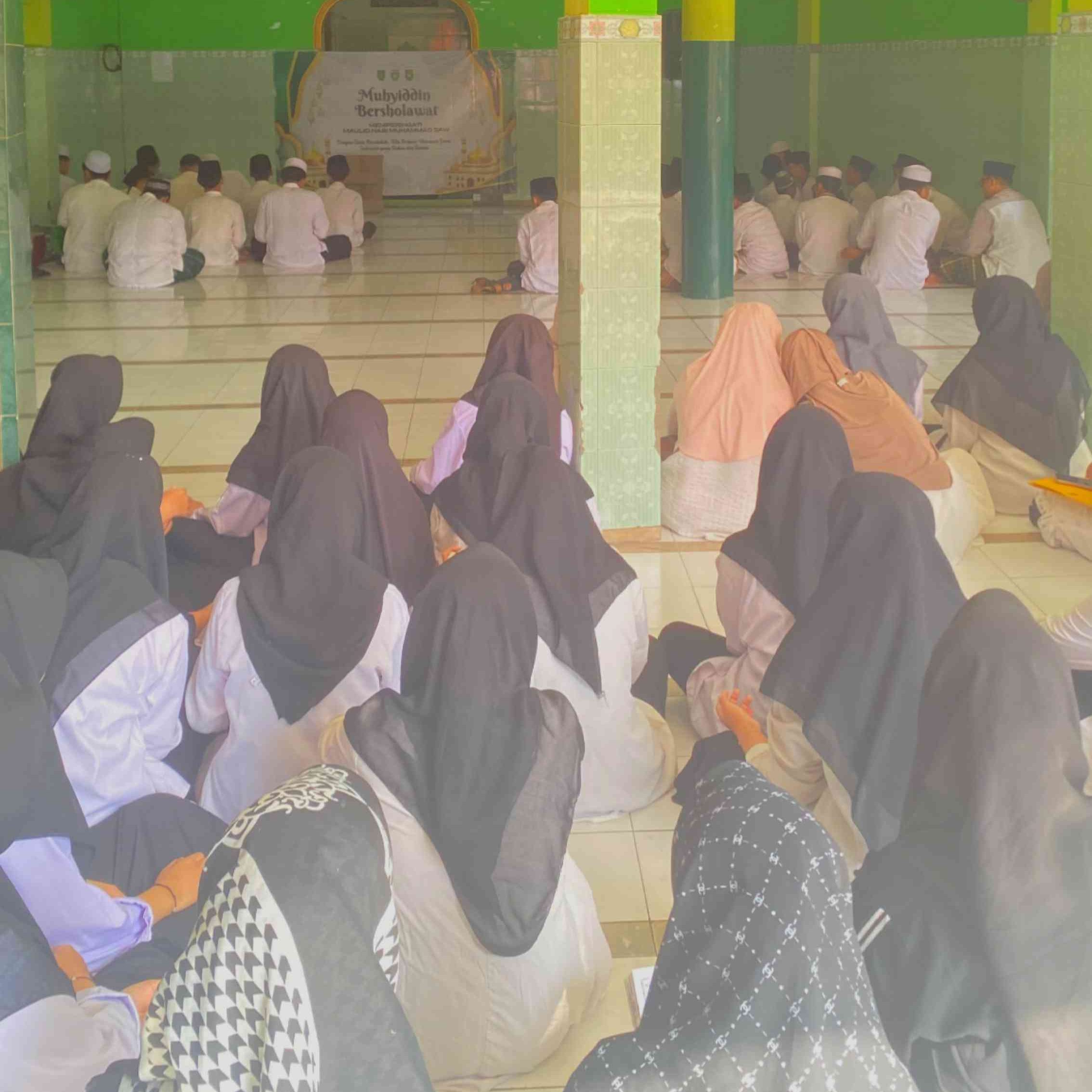 Suasana khidmat peringatan Maulid Nabi di Pondok Pesantren Muhyiddin. Santri MTs, MA – putra dan putri duduk terpisah mengikuti acara dengan penuh perhatian, sesuai dengan tema “Dengan Cinta Rasulullah, Kita Perkuat Ukhuwah Demi Indonesia yang Rukun dan Damai.”