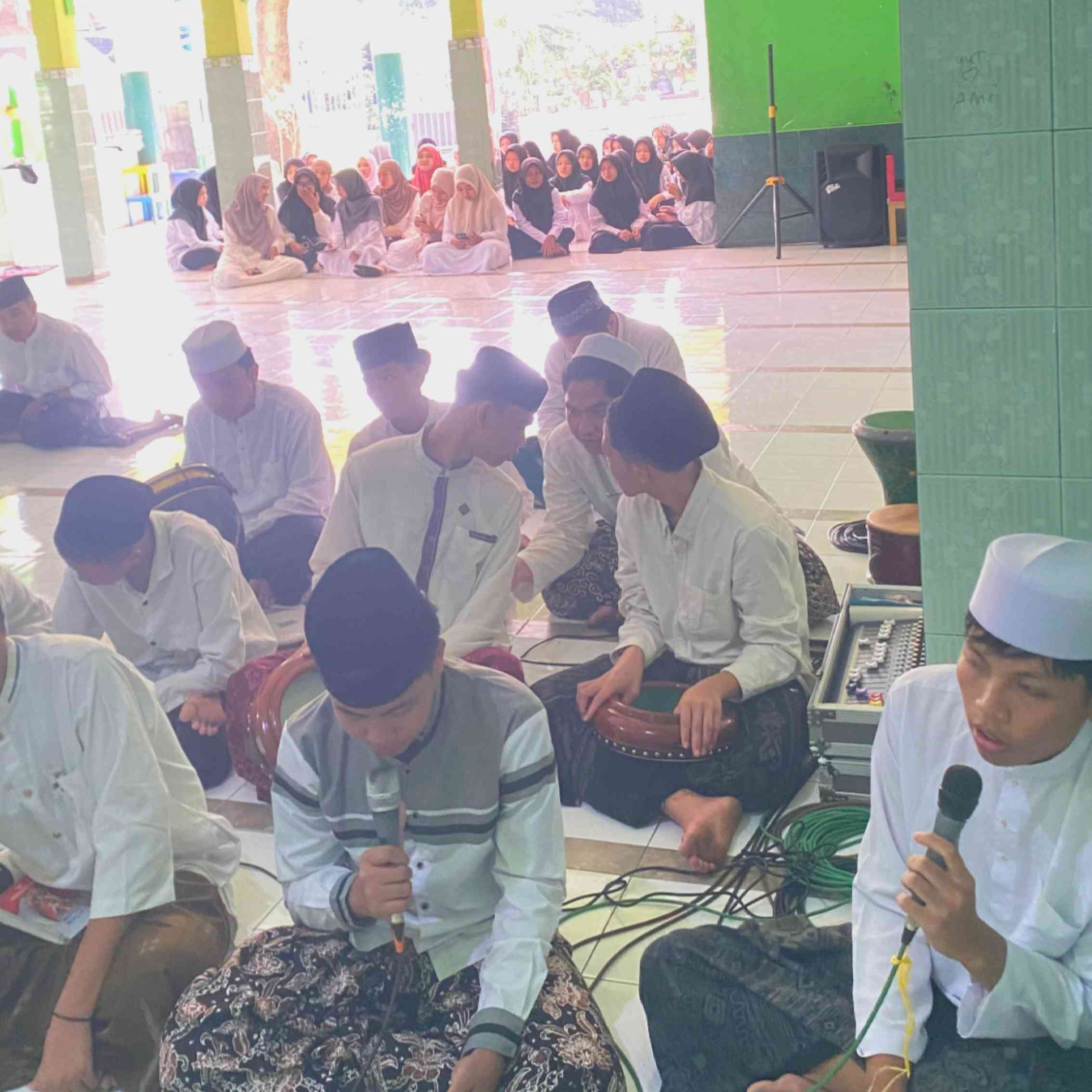 Grup hadrah santri Muhyiddin melantunkan sholawat dengan iringan rebana, menciptakan suasana religius dalam peringatan Maulid Nabi Muhammad SAW yang diikuti oleh seluruh santri dan para ustadz-ustadzah.